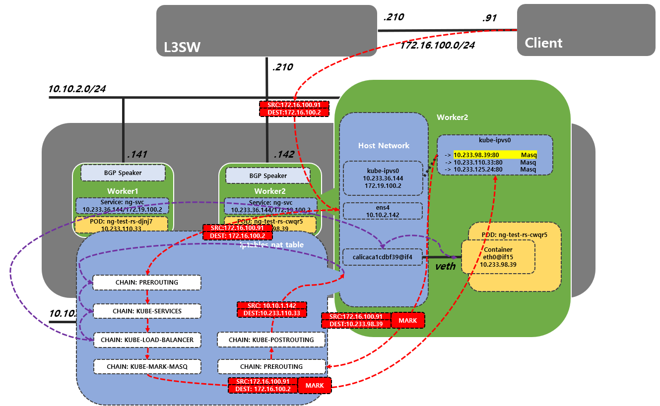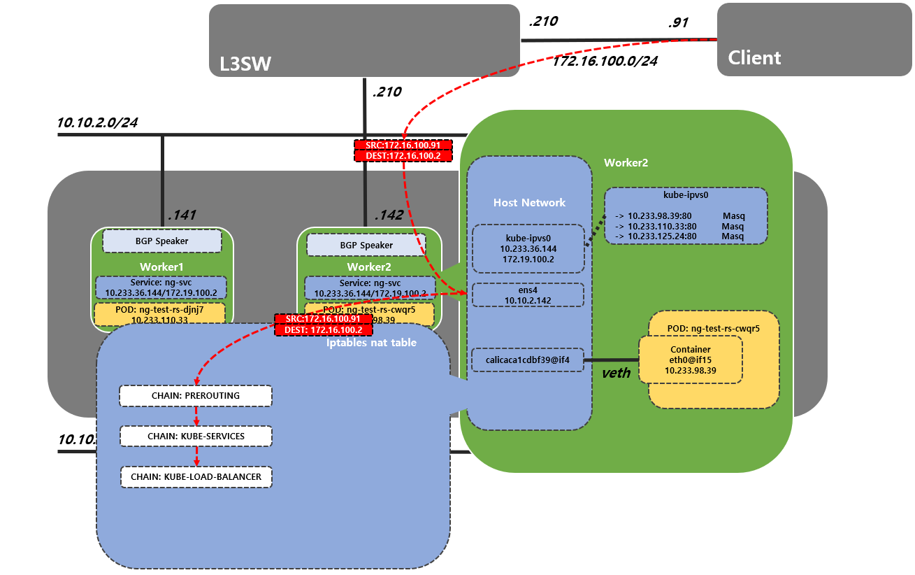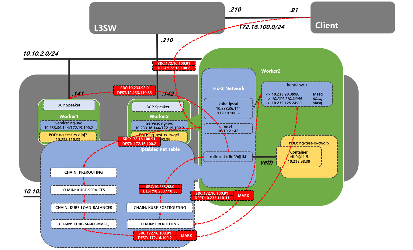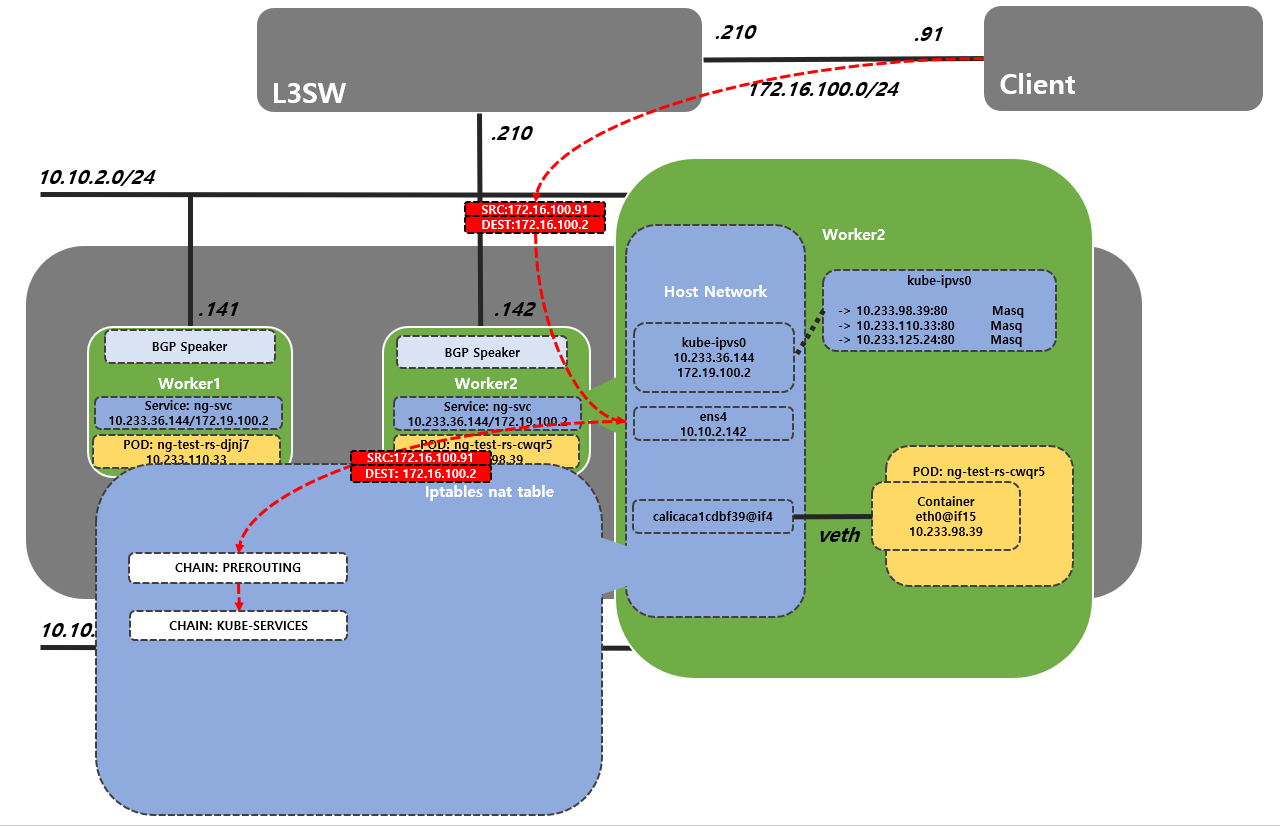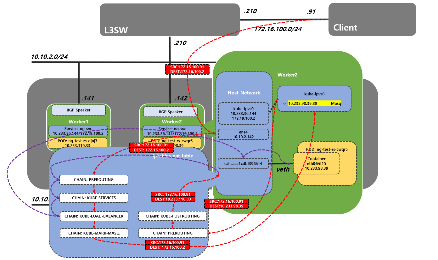 다시 외부 client 로 응답 보낼때는 container 에서는 출발지 아이피를 자신의 container ip로 하고, 도착지 아이피를 worker2 의 tunl0인터페이스 아이피로 전달 하게 된다. worker2에서는snat,dnat 된 것을 다시 반복 하여 client로 통신 하게 되는 구조를 갖는다.