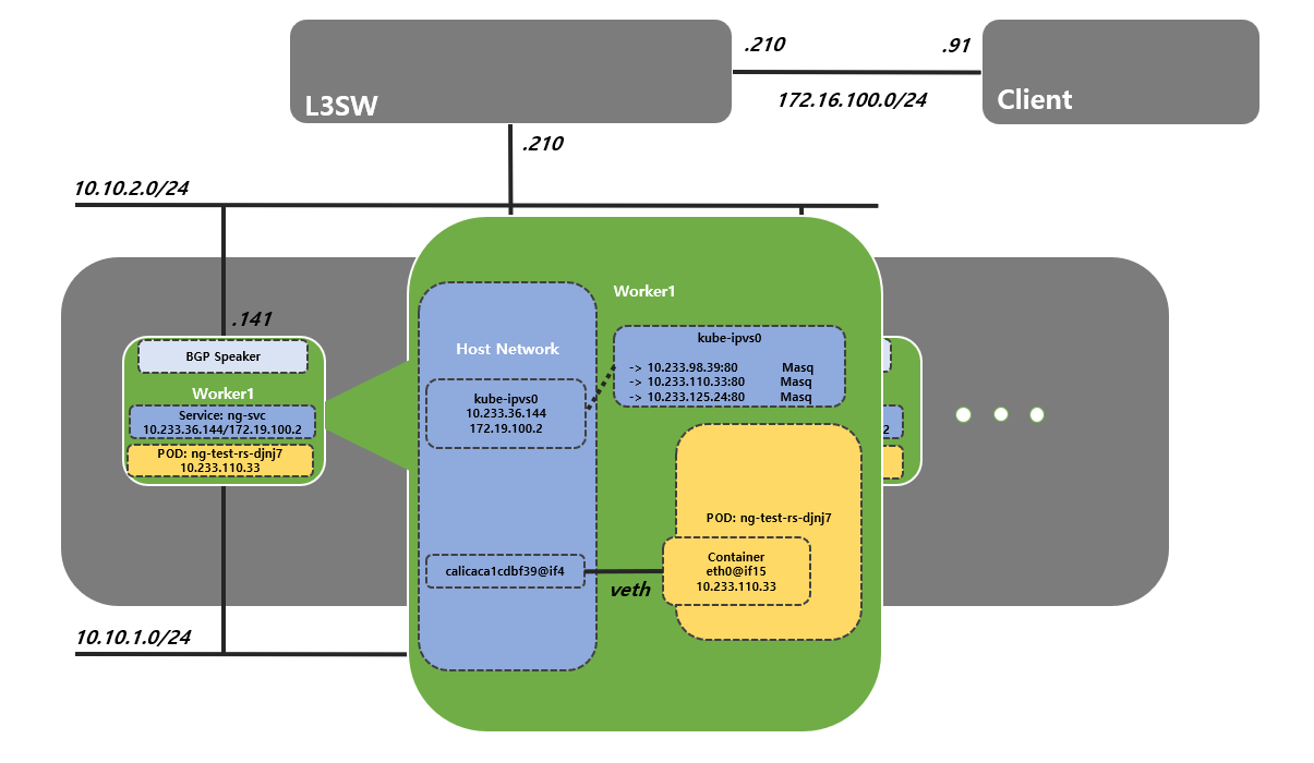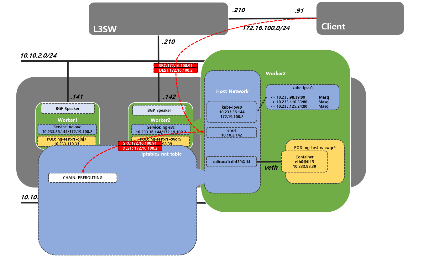 외/내부에서는 실제로 service를 통하여 요청을 보내게 되는데, Cluster IP 와 Loadbalancer IP 모두 kube-proxy의 ipvs 를 통하여 로드밸런싱 된다.