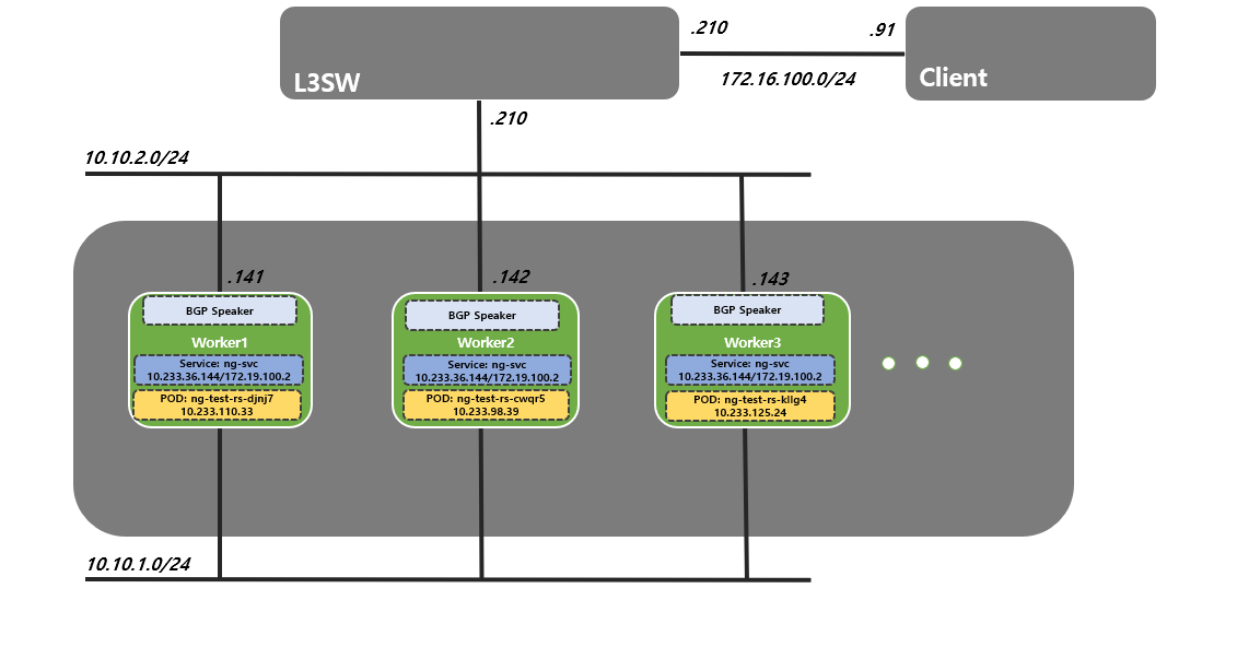 위 label이 설정된 노드들에 nginx container 가 동작하는 pod와 meltalLB로 구성되어 있는 LoadBalancer 서비스를 생성 한다.